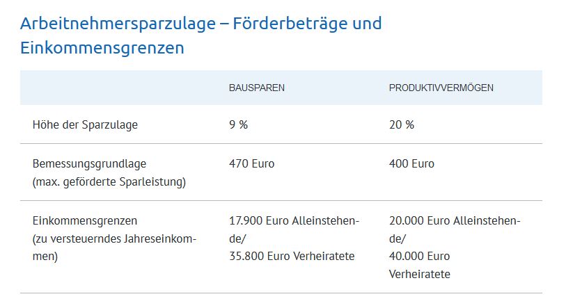 Arbeitnehmersparzulage zahlt der Staat für vermögenswirksame Leistungen jährlich bis zu 470 Euro beim Bausparen und bis zu 400 Euro beim Produktivvermögen. Bausparen ist die einzige risikolose Sparform, die gefördert wird. Die Sparzulage beträgt 9 Prozent und wird gewährt bei einem zu versteuernden Jahreseinkommen von bis zu 17.900 Euro (Ledige) bzw. 35.800 Euro (Verheiratete). Die Bindungsfrist beträgt sieben Jahre.